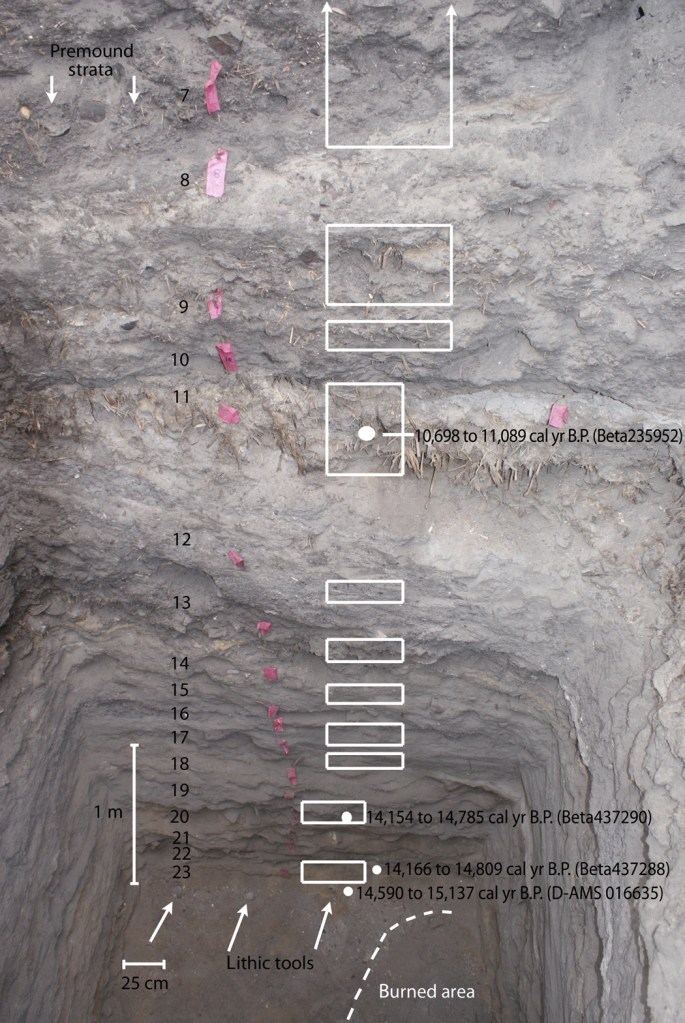 Perfil estratigráfico de la Unidad 12 que muestra depósitos culturales basales tempranos y fechas de radiocarbono. (Crédito de la foto: Tom D. Dillehay, Universidad de Vanderbilt)