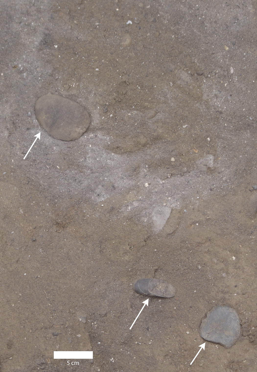 Quemado y otros rasgos culturales y escamas uniformes de basalto en la Capa 20, Unidad 12. (Crédito de la foto: Tom D. Dillehay, Universidad de Vanderbilt)