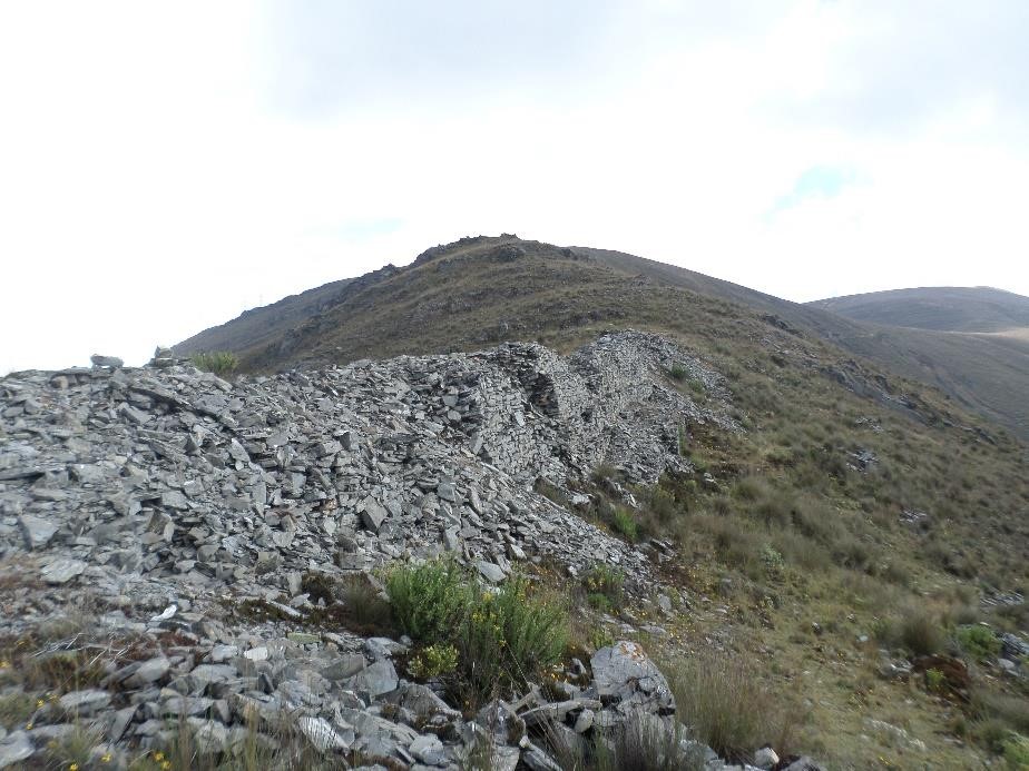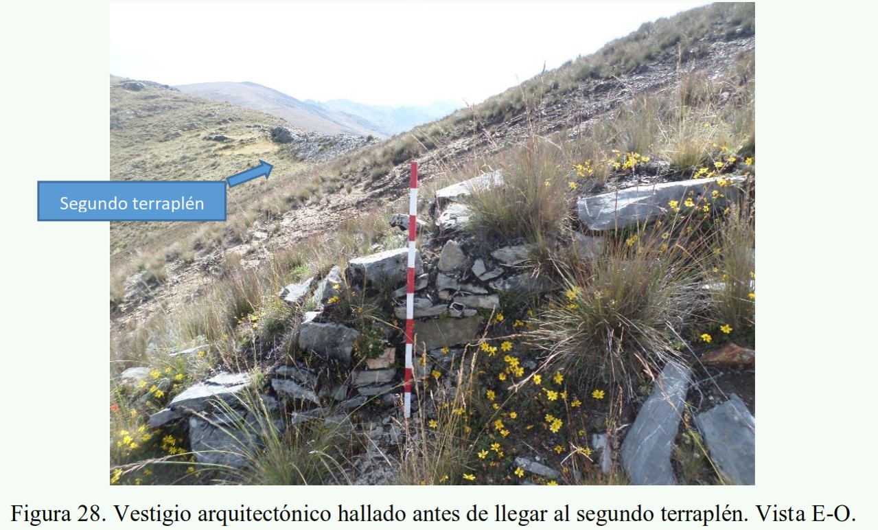 Al llegar a dicha quebrada, vuelve a tomar el rumbo oeste por unos 2 kilómetros, no sin antes pasar por una serie de pequeños terraplenes construidos para salvar los desniveles del relieve, los cuales se encuentran en su mayoría colapsados. Se distinguen las piedras en la parte inferior del cimiento de los muros producto del colapso de estas estructuras. Algunos de estos muros midieron entre 2 a 3 metros.