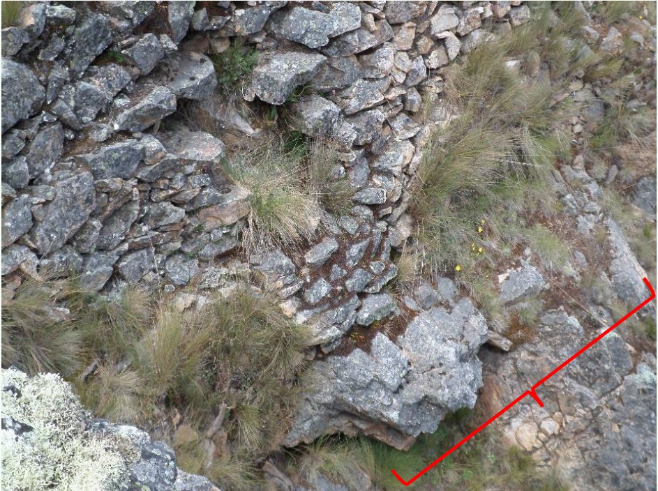 Algo de resaltar aquí, es la percepción que los antiguos peruanos tenían con la naturaleza de sus construcciones. Se pudo identificar de manera fehaciente, como los constructores fijaron como cimiento de los muros, las grandes rocas del mismo cerro. Es decir, aprovecharon las características geomorfológicas de la zona para levantar estos grandes muros de contención (ver figura 40).