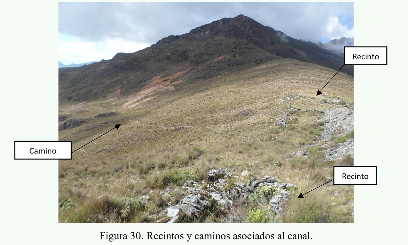 Sus primeros 200 metros los hace en dirección noroeste, luego, al llegar a la quebrada Capado Cocha (donde recibe las aguas de la laguna del mismo nombre), gira en dirección suroeste unos 2 kilómetros. En este punto vuelve a dirigirse hacia el norte, en dirección de la laguna Coñocranra. Luego, después de recibir las aguas de esta laguna, gira en dirección oeste. Sigue en esta dirección 1 kilómetro. A esta altura el canal es totalmente perceptible al ojo humano. Fue aquí donde se logra distinguirlo como tal. Asociado al canal se encuentra un aparente camino de herradura a unos 20 metros más abajo. Es aquí donde el canal pasa por una serie de acantilados, en donde el constructor no pudo horadar la roca y levanto inmensos muros de contención de hasta 10 metros. Lo resaltante de ello, radica en que algunos permanecen intactos al paso del tiempo y los movimientos sísmicos (ver figura 24 y 25).