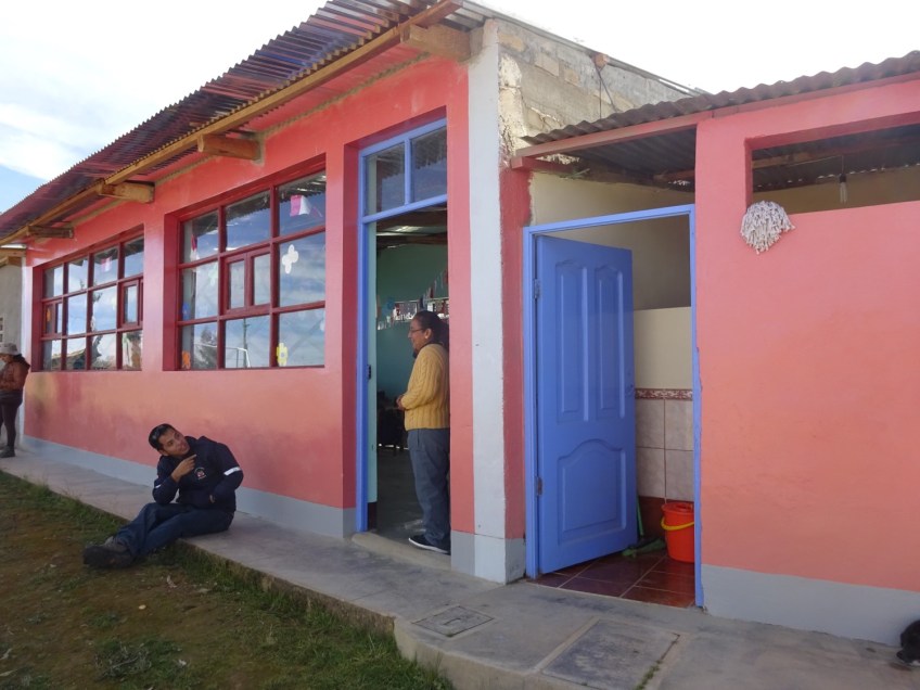 Conversando con la profesora del lugar, con baños decente. Conversing with the teacher the place. College with a decent bathroom