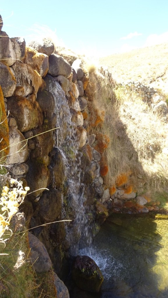 En la parte central esta esta caída de agua, es probable que la presa haya trabajado de diferente forma en sus inicios. El lugar no es una laguna propiamente dicha, sino un humedal que capta las aguas de la cordillera