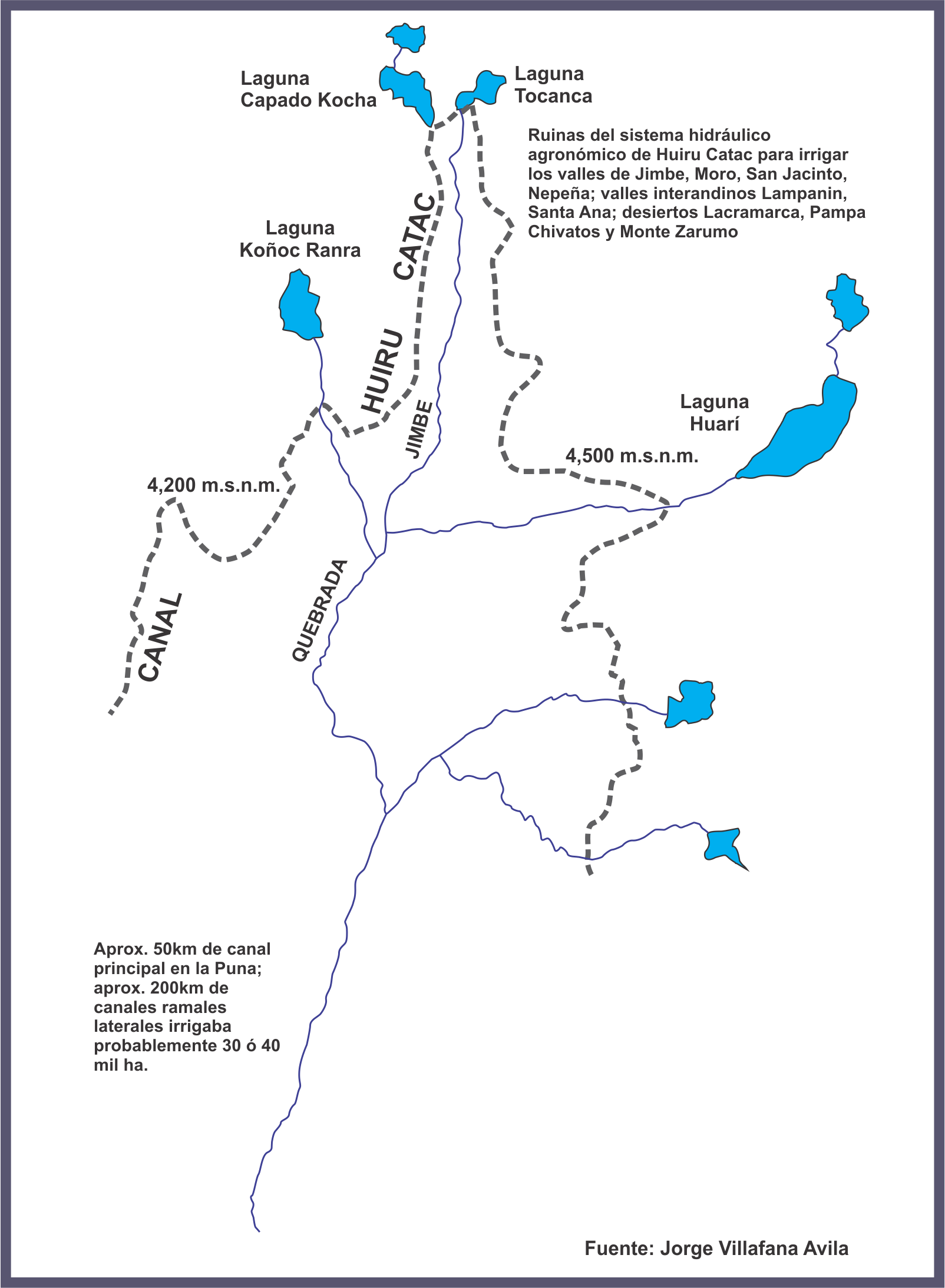 A living example is the Huiru Catac Irrigation System, located in the high part of the Nepeña River Basin in the district of Huayles in Ancash, where through a system of interconnected lagoons (Coñoc Ranra, Capado Cocha, Tocanca among others), united by the Huiu Catac canal for more than 10 km, according to scholar Dr. Jorge Villafana Avila, carry the water from the Nepeña River Basin to the Santa Lacramarca River Basin.