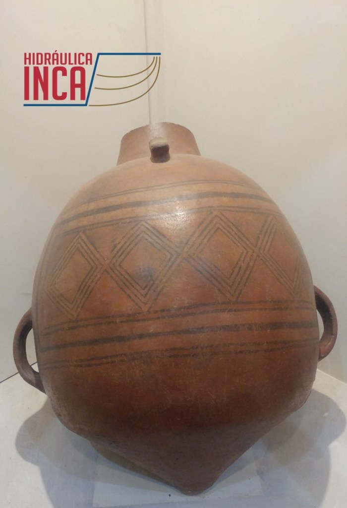 Aribalo con decoración pintada con motivos de helechos y figuras geométricas, presenta un apéndice de una parte central, su morfología es una evolución a un aribalo Inca clásico