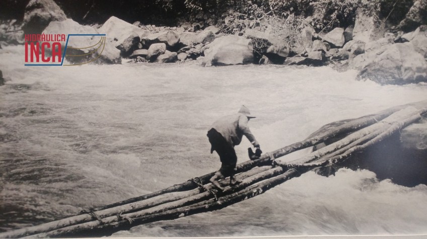 Melchor Arteaga, residente de Mandor Pampa y guía de Bingham, cruzando el río Vilcanota usando el puente de palos en la mañana de 24 de julio de 1911. Después de tomar esta fotografía, Bingham cruzó el mismo puente (Foto: Hiram Bingham)