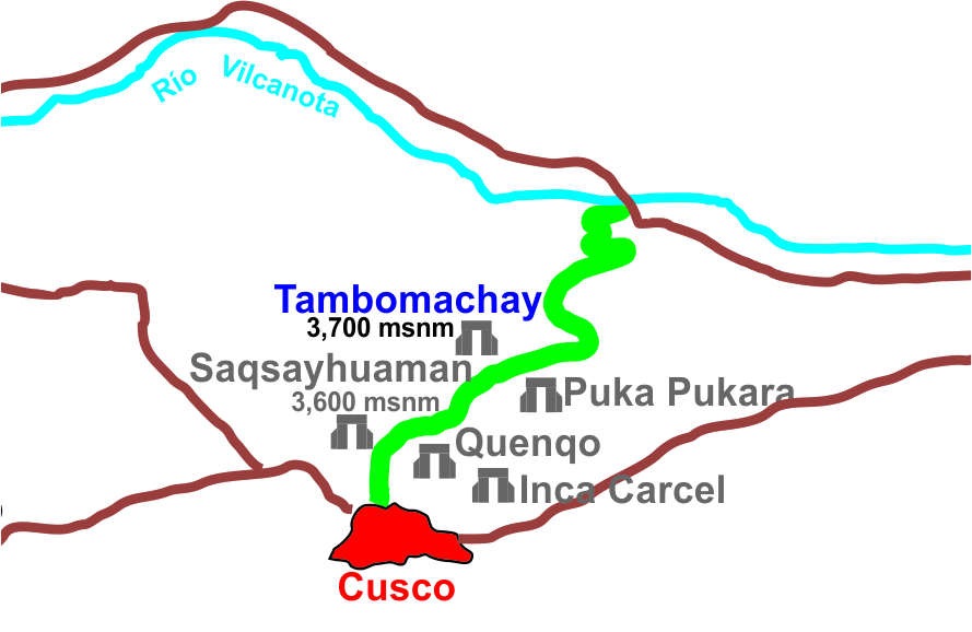 Tambomachay se ubica a escasos 8 km de la ciudad del Cusco y forma parte del Parque Arqueológico de Sacsayhuaman, lo encontramos sobre los 3,700 msnm por encima del Cusco (3,470 msnm).