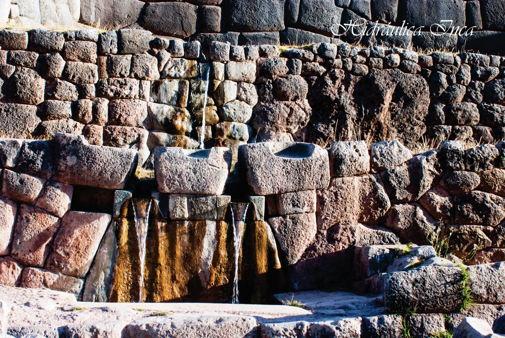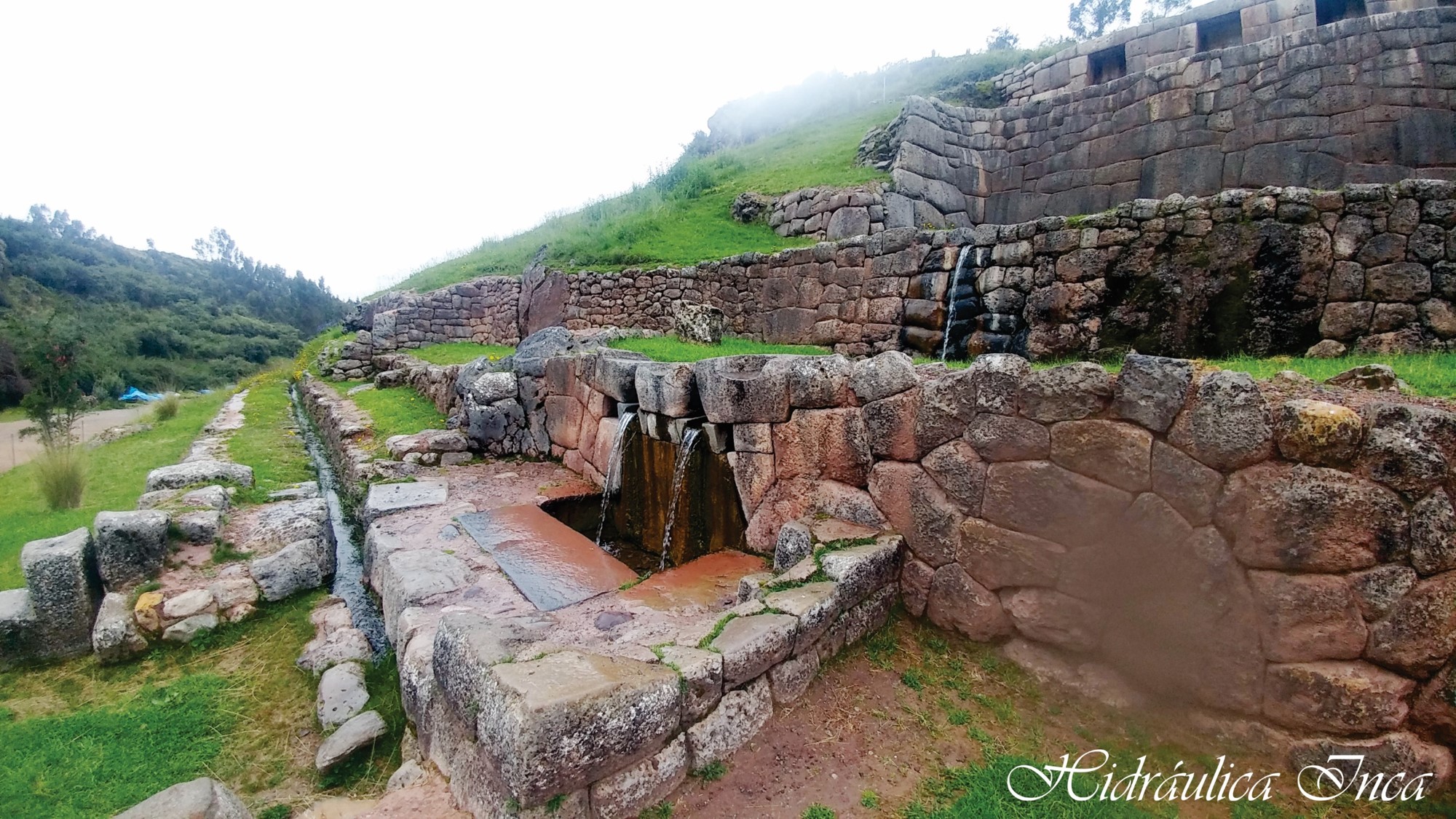 Apreciamos un conjunto de tres sistemas de andenes, en el segundo anden, se ubica el canal de derivación de las aguas, que indican provienen de un manantial, que vierte sus aguas en una sola caída, para entregar sus aguas en una poza, que vierte luego sus aguas en dos hermosos chorros a una poza de captación. Cuenta la leyenda que a este lugar venia el Inca Yupanqui a cazar, energizarse y tomar estas aguas que, según nuestra guía, tenía el poder de la eterna juventud. Claro que nosotros tomamos una botella generosa de este mágico lugar y llevamos al Cusco para hacerlo en el transcurso de los días que estuvimos haciendo este recorrido. Encima de estos hermosos chorros apreciamos un conjunto de cuatro (04) hornacinas, lugar de ofrenda que señala una vez más lo sagrado del lugar y probablemente la importancia ceremonial de este recinto.