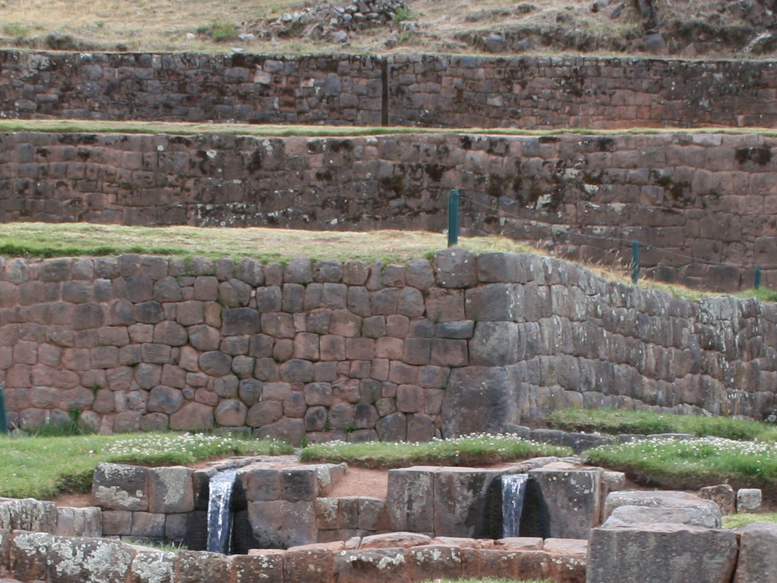 Viendo las fotos me sorprende en la caída de agua de 4 chorros en piedras labradas, por debajo de los chorros hay otros chorritos delgados que salen por unos conductos que parecen hechos con taladro, que no me explico como pudieron hacerlo sino conocían metales mas duros que el bronce y esto.