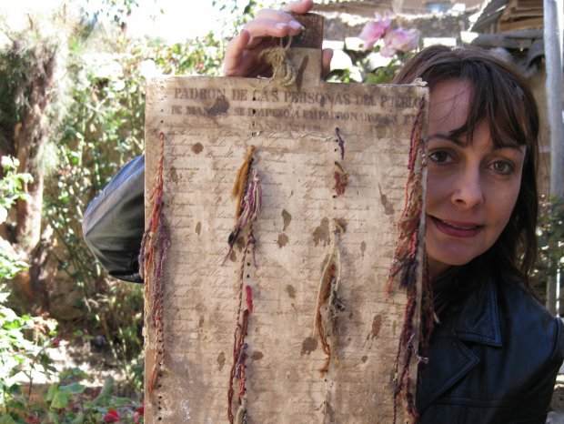 Documentos: Sabine Hyland muestra un antiguo documento de la comunidad de San Juan de Collata, en la provincia de Huarochirí
